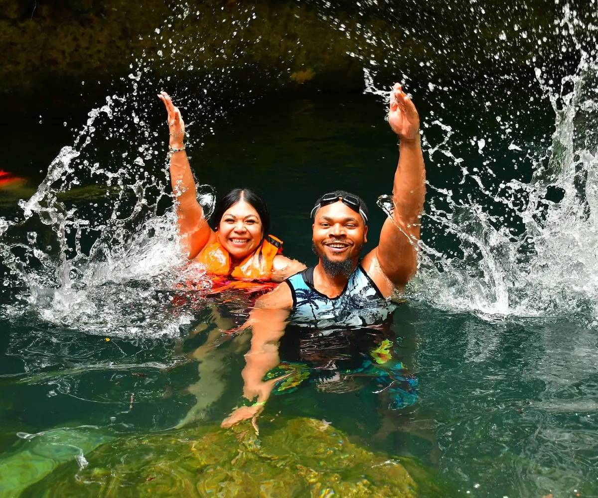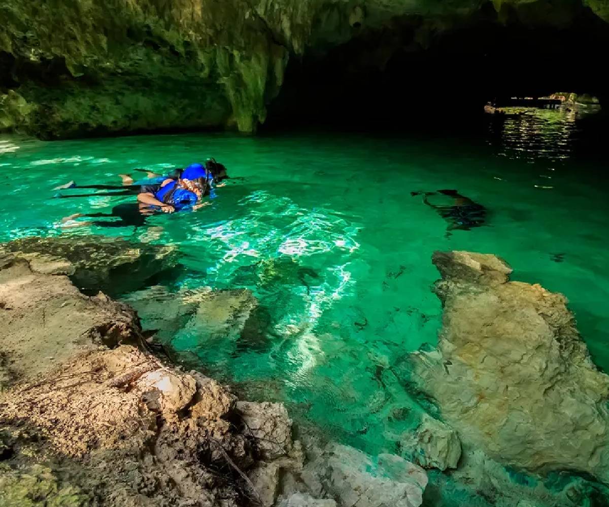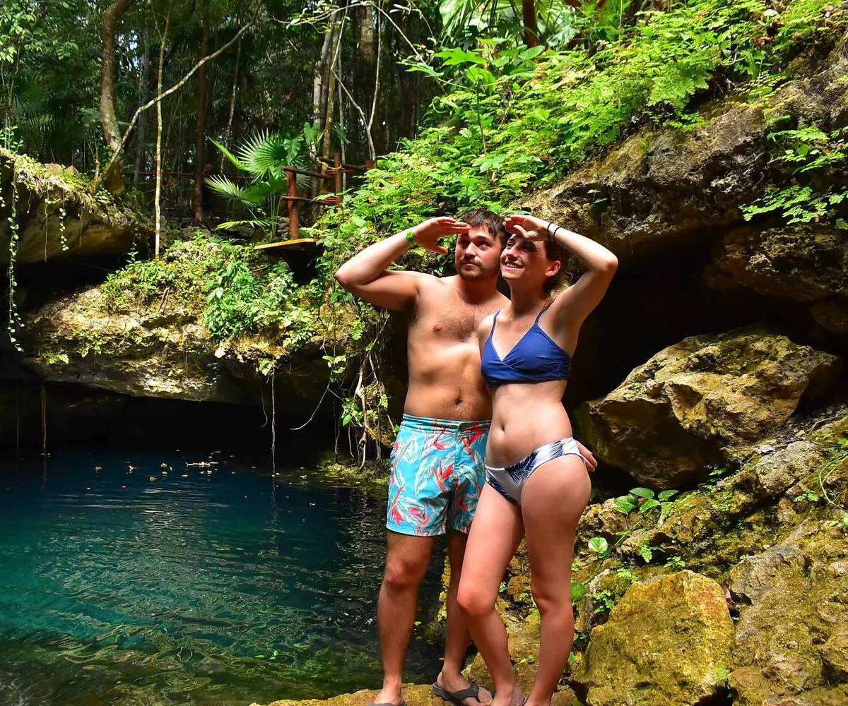 Luego, vive una experiencia de cenote adventuring privado en un ambiente mágico. Nada en aguas azules y refrescantes, desafía tu valentía saltando desde un pequeño acantilado, y explora el fondo con snorkel. Este cenote ofrece un entorno ideal para disfrutar con tus seres queridos.