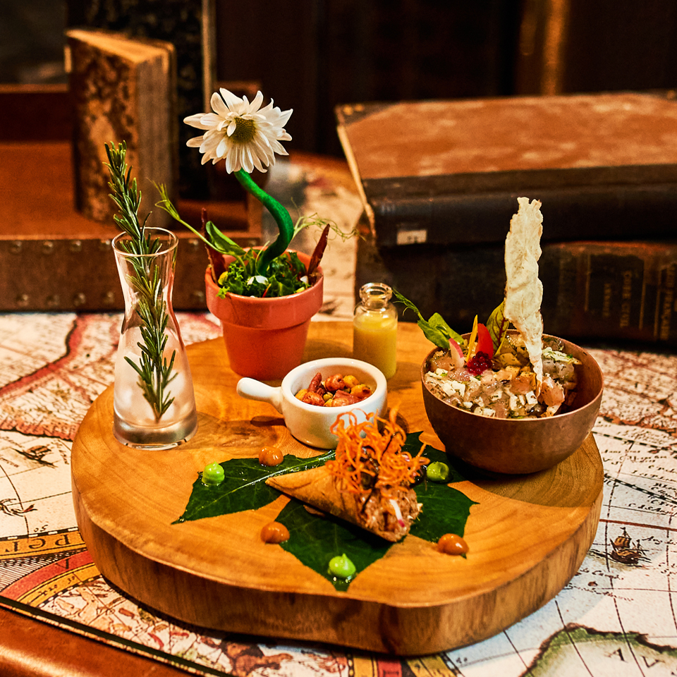 - Cena de 3 tiempos con platillos inspirados en la selva maya.